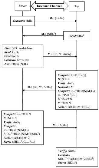 - Peris-Lopez, P.; Hernandez-Castro, J.C.; Estévez-Tapiador, J.M.; Ribagorda, A. LMAP: A Real Lightweight Mutual Authentication Protocol for Low-cost RFID Tags. In Proceedings of the 2nd Workshop on RFID Security, Graz, Austria, 12–14 July 2006; pp. 6–17. [Google Scholar]
