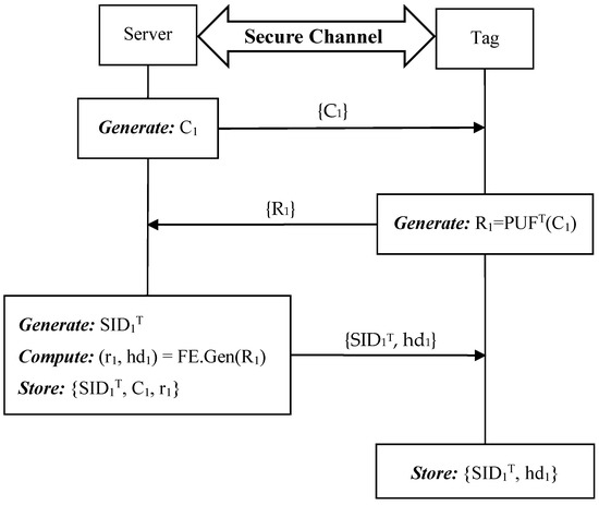 Similar to our ideal PUF-based protocol, when a new tag T joins in the RFID system, the tag needs to be registered into the backend server via a secure channel. The setup phase of the enhanced protocol is shown in Figure 6.