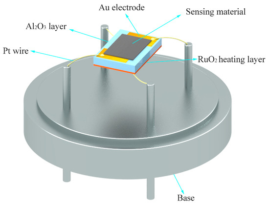The as-prepared SNM powders were added into ethanol solution. After three minutes stirring, SNM were evenly distributed, forming a paste, and then drop-coated on an alumina substrate with two L gold electrodes on its top surface and a ruthenium oxide heating layer on its bottom surface. A schematic of the sensor is shown in Figure 1.