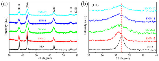 Full XRD patterns of the pure NiO and SNM are exhibited in Figure 2. All the diffraction peaks of the pure NiO and SNM samples can be attributed to a face-centered-cubic NiO phase (Fm-3m, JCPDS No. 47-1049), and no other structural phase is observed. The (111) peaks of the pure NiO and SNM shown in Figure 2b reveal that the peaks of all the SNM shift slightly to lower angles, indicating that the Sn2+ doping on the host NiO can slightly expand NiO lattice parameter. These observed results are consistent with literature reports of Sn doped NiO samples (loaded with 1.5 at% Sn2+) [17]. These results might be due to the incorporation of Sn2+ into the interstitial positions of the NiO lattice because the radius of Sn2+ with a coordination number of 6 is 1.18 Å, which is larger than that of Ni2+, 0.69 Å, with the same coordination number. Accordingly, the Sn2+ dopants prefer to occupying the interstitial positions [17,18]. In addition, the diffraction peaks becoming broader with increasing Sn2+ amount indicates a decrease in the crystallite size. According to the Scherrer equation (D = 0.89λ/βcosθ), the average crystal sizes of the pure NiO and the 2, 4, 8, and 12 at% SNM are 18.2, 14.3, 12.6, 10.9, and 10.0 nm, respectively. More Sn2+ doping may prevent NiO crystallites from further grain growth.