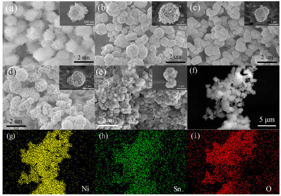 The shape and composition of the as-prepared pure NiO and SNM were examined by SEM. As shown in Figure 3, the SEM images of the pure NiO samples reveal the presence of flower-like microspheres with uniform distribution and an average diameter of ~1.5 μm. A single flower-like NiO microsphere shown in the inset of Figure 3a reveals that the microsphere consists of multiple curving low-dimensional nanosheets with porous surfaces. The morphologies of SNM-2, SNM-4, SNM-8, and SNM-12 are also shown in Figure 3b–e, respectively. These samples have a slightly lower dispersity and relatively poor uniformity in diameter in comparison with the pure NiO. Furthermore, as the concentration of Sn2+ increases, SNM become denser. The corresponding single microspheres for the SNM samples are also shown in the insets of Figure 3b–e. In addition, the elemental mapping of SNM-8 shown in Figure 3f–i reveals that all three main elements, i.e., nickel (Ni), tin (Sn), and oxygen (O), are uniformly distributed, indicating that Sn2+ is successfully doped into whole NiO microspheres.