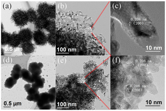 The TEM and HRTEM measurements of the NiO and SNM-8 samples were performed to further investigate the morphologies and crystallographic features, and the results are shown in Figure 4a–c and Figure 4d–f, respectively.