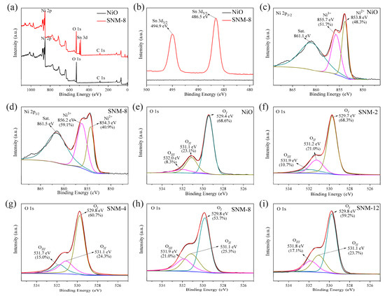 (a) Survey XPS patterns of the pure NiO and SNM-8 samples; (b) Sn 3d spectrum of the SNM-8 sample; (c,d) Ni 2p3/2 high-resolution XPS spectra of the pure NiO and SNM-8, respectively; (e–i) O 1s high-resolution XPS spectra of the pure NiO, SNM-2, SNM-4, SNM-8, and SNM-12 samples, respectively.