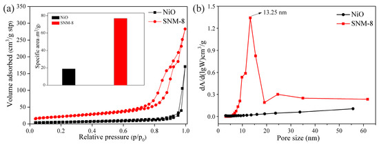 (a) N2 adsorption-desorption isotherms of the NiO and SNM-8 samples, and the inset is the corresponding BET specific surface areas of the NiO and SNM-8 samples; (b) Pore size distribution curves of the NiO and SNM-8 samples.