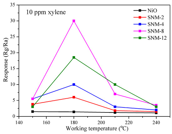 Gas responses of the NiO and SNM sensors toward 10 ppm xylene at different working temperatures.