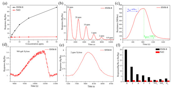 (a) Responses of the NiO and SNM-8 sensors as a function of the xylene concentration at 180 °C; (b) Dynamic response of the SNM-8 sensor to 0.9-50 ppm xylene at 180 °C; (c) Response and recovery times of the SNM-8 sensor to 10 ppm xylene at 180 °C; (d,e) Response curve of the SNM-8 sensor to 900 ppb and 2 ppm xylene at 180 °C, respectively; (f) Gas responses of the SNM-8 sensor to 10 ppm of various VOCs (X, xylene; T, toluene; A, acetone; F, formaldehyde; E, ethanol), 10 ppm NO2, 100 ppm NH3, and 100 ppm H2 at 180 °C.