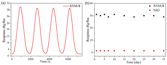 Another important aspect of gas sensors for practical applications is the repeatability and long-term stability of the sensor material. The reproducibility and long-term stability of the SNM-8 sensor in detecting 10 ppm xylene at 180 °C were examined, as shown in Figure 9. Figure 9a shows that the response of the SNM-8 sensor remains stable after four cycles. Figure 9b shows that during the 30-day test, the responses only vary slightly near the average value of 30, indicating the good stability of the SNM-8 sensor.