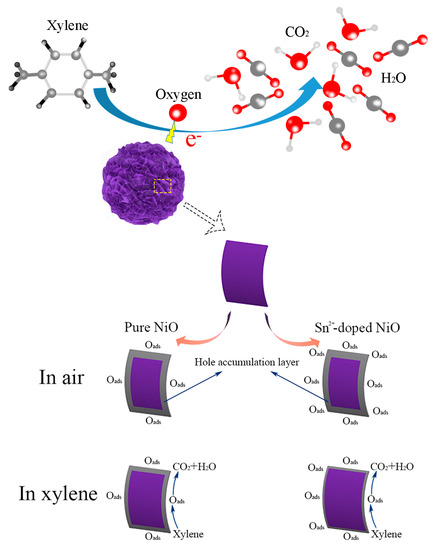 As a typical p-type oxide, the main carriers in NiO and the SNM in these experiments are assumed to be positive holes. When NiO and the SNM are exposed to air, oxygen molecules adsorb on their surfaces, forming the chemisorbed oxygen species O2− (T < 150 °C), O− (150 C < T < 400 °C), and O2− (T > 400 °C), which is accompanied by the capture of electrons from the conduction band and the consequent decrease in their resistance [33]. As illustrated in Figure 10, when NiO and the SNM are exposed to xylene, the adsorbed xylene is oxidized by the as-adsorbed oxygen species and transformed into CO2 and H2O. Simultaneously, the electrons extracted from xylene are transferred back to the conduction band, finally resulting in a decrease in the concentration of hole carriers and an increase in the resistance. The detailed reaction processes at a Tw of 180 °C can be expressed as follows [34]:
