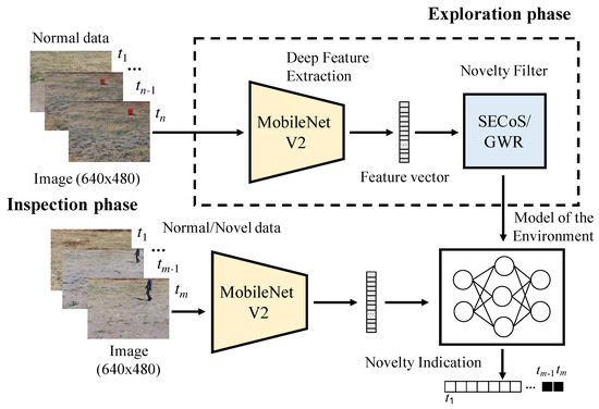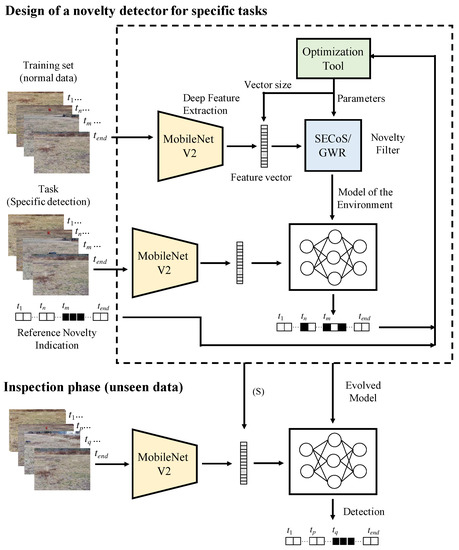 Flowchart of the visual novelty detection for specific tasks. In the training phase, the novelty filter learns to detect a specific object. In the inspection phase, the evolved model is used to detect the object(s) in the environment.