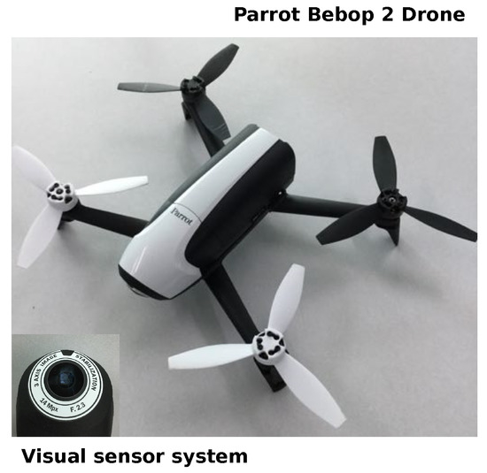 Parrot Bebop 2 Drone with a 14-Mpx flight camera. In the bottom-left corner, we show its visual sensor system.