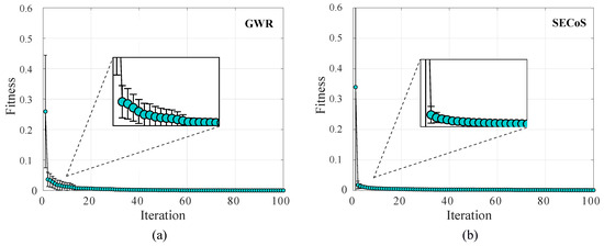 Average fitness value of the best-evolved detectors by using the artificial bee colony (ABC) algorithm in the 30 independent runs on dataset D-2. The detectors used the MNF feature extraction technique: (a) GWR detector; (b) SECoS detector.