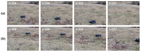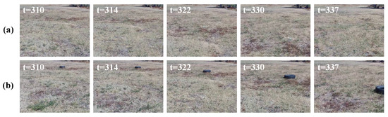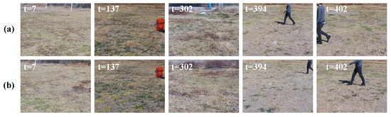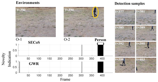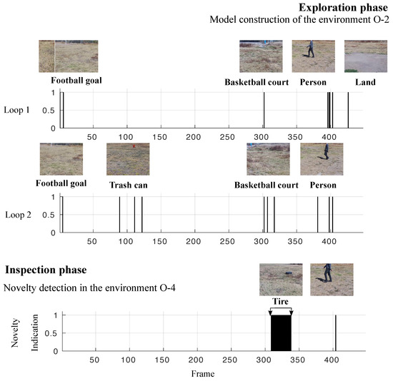 Failure cases in the evolved GWR detector on dataset D-4: (a) sample image frames in the exploration phase, and (b) false novelty indications in the inspection phase. In the exploration phase, the UAV explores environment O-3. Then, it should detect the person as the novelty in environment O-4. In the inspection phase, due to changes in perspective in the frames induced by the UAV’s flight, some false novelty detections were presented because the information of the frame encoding was too different from the learned model.