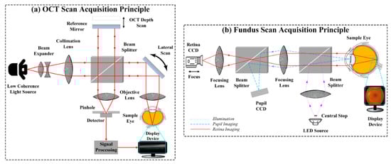 Working principle of retinal imaging modalities. (a) Optical coherence tomography (OCT) scan acquisition principle and (b) the fundus scan acquisition principle.