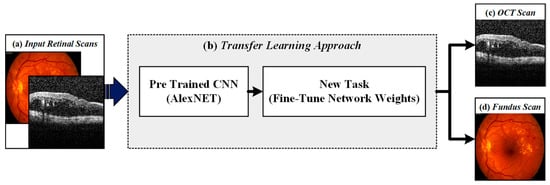 Retinal imaging modality recognition stage. (a) Input retinal scans; (b) transfer learning approach using AlexNet CNN architecture; (c) recognized OCT scan and (d) recognized fundus scan.