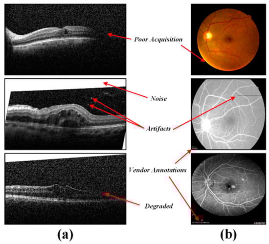 Degraded retinal scans. (a) OCT Scans and (b) fundus/ fluorescein angiography (FA) scans.