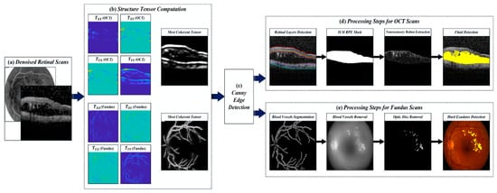 Extraction of clinically significant ME pathological symptoms. (a) Denoised retinal scans; (b) structure tensors computation stage; (c) detection of edges using the canny edge detection method; (d) processing steps for OCT scans and (e) processing steps for fundus scans.