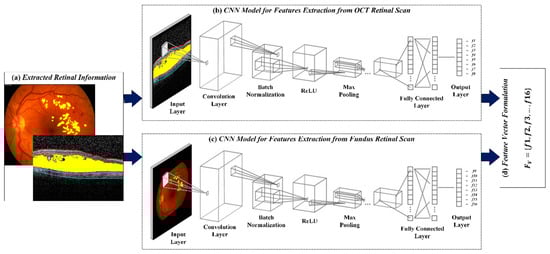 CNN for feature extraction. (a) Overlaid retinal scans with ME pathological symptoms; (b) CNN model for feature extraction from OCT retinal scans; (c) CNN model for feature extraction from retinal fundus scans and (d) 16-D feature vector containing eight OCT () and eight fundus features ().