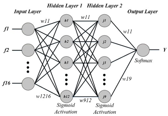 In this study, we used a feed forward artificial neural network classifier with one input layer, one output layer and two hidden layers. The input layer consisted of 16 nodes as per the extracted features. For hidden layers, we experimented with two to 40 nodes to find the optimum architecture (12 for the 1st hidden layer and nine for the 2nd hidden layer) of the neural network. A single output layer node gave the final classification probability. The sigmoid function was used for activation in each hidden layer whereas the final output layer contained softmax as the activation function. The weights during training were updated through gradient descent. Figure 8 shows the architecture of ANN used in the proposed study.