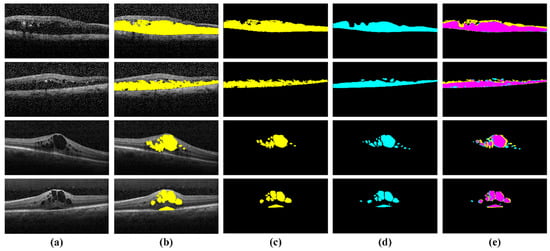 Extracted retinal fluid regions in the [35,36] datasets. (a) Original OCT scans; (b) overlaid retinal fluid regions on original OCT scans; (c) extracted retinal fluid regions through the proposed system; (d) local clinician markings of retinal fluid regions (e) retinal fluid extraction against expert markings—cyan represents the expert markings of local clinician, yellow represents the retinal fluid regions extracted through the proposed system and magenta represents the overlapped region of retinal fluids.