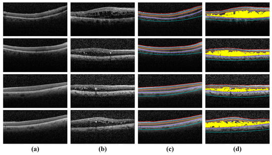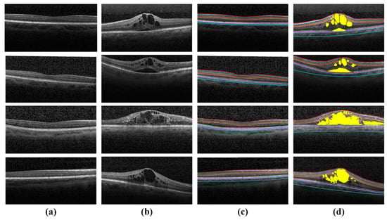 Healthy and ME OCT scans in the Rabbani dataset [36], which are processed by the proposed system. (a) Original healthy OCT B-scans; (b) original ME OCT B-scans; (c) classified as healthy by the proposed system and (d) classified as ME by the proposed system.