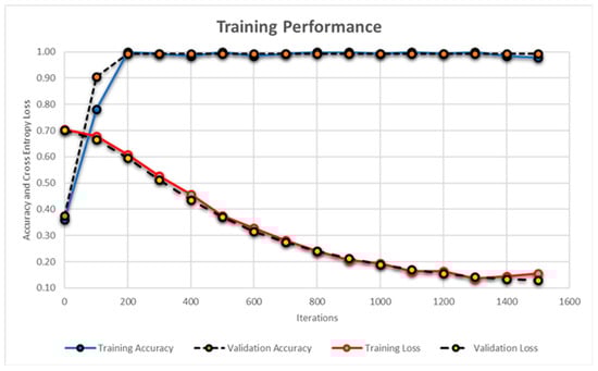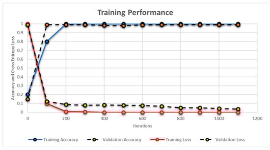 Apart from this, for every 100 iterations, the validation was performed where validation performance was also measured through accuracy and cross-entropy loss function. The validation was performed in order to get the unbiased evaluation of the candidate model during the training phase as evident from Figure 16 and Figure 17. Furthermore, we employed 50% dropout layers within each model to reduce overfitting on the dataset. The proposed CNN model achieved the accuracy of 99.23% in 1500 iterations during the training phase while the AlexNet model achieved the accuracy of 98.79%. These results were obtained through MATLAB R2018a and Table 10 shows the details of systems and software along with the average time required for computing the results by each classifier. Although, the average time of hybrid classifier was a few seconds more than individual classifiers, the accuracy achieved by the proposed classification model was 94.33%.