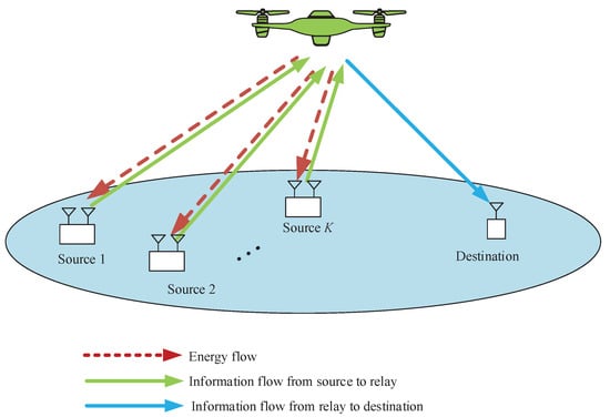A UAV-enabled WPCN is considered as illustrated in Figure 1. In this model, a UAV acts as a mobile relay that is dispatched to transmit the information from multiple sources to the destination over the area of interest. Assume that the destination has stable power supply, and the UAV also has stable power supply onboard and the equipped energy is sufficient to support the task in the finite period time T, but there is no power supply embedded in the sources. For information reception, the UAV needs to travel over the sources to operate WPT in downlinks, and the sources utilize the harvested energy to support WIT in uplinks. All sources are equipped with two antennas that are dedicated for energy harvesting and WIT, respectively. The UAV is also equipped with two antennas for WPT and information reception or transmission, while the destination is equipped with single antenna for information reception.