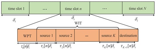 where . Furthermore, the inequality in Equation (15) indicates the 1st time slot just for WPT, i.e., , and the N-th time slot do not operate WPT, i.e., .