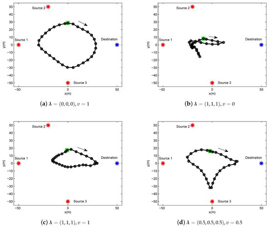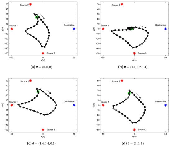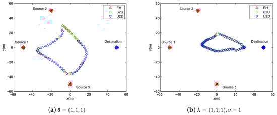 In this section, we present the numerical results to evaluate and validate Algorithm 1, as compared to the benchmark. We considered three source nodes in the area of interest, i.e., . The UAV’s altitude was fixed at m. The transmit power of the UAV for WPT was set as w, and the sources’ peak power was set as dBm. The UAV’s average power budget and peak power were set as dBm and dBm, respectively. In addition, we set the energy harvesting efficiency as , and the length of time slot as s. The communication bandwidth is MHz. Furthermore, we set dBm and dB. The maximum speed of the UAV was set as m/s. For convenience of expression, we use vectors and to present the factor values of multiple sources for delay-tolerant case and delay-sensitive case, respectively, with denoting the required throughput of the source k over the average system throughput throughout the whole period time, and denoting the required throughput of the source k over the average system throughput in each time slot. For illustrating the location changes of the UAV, the trajectory is marked by “◯”s every 2 s. Meanwhile, the initial/final location of the UAV is marked by “□”s, as shown in Figure 3 and Figure 4.