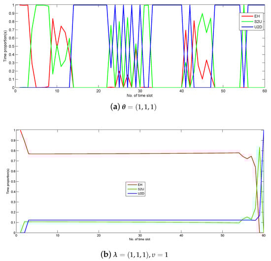 Figure 6 shows the specified time proportion of scheduling in each time slot for delay-tolerant case with and delay-sensitive case with under period s. The scheduling in each slot is sorted into three operations, i.e., EH, S2U and U2D, as illustrated in Figure 5. As shown in the picture, EH is first operated as some sources have no residual power at the beginning. For the delay-tolerant case (i.e, Figure 6a), both the information uploading and information forwarding executions depend on the channel quality in each time slot. In other words, the UAV tends to communicate with the nearest node for enjoying larger information transmit rate. For the delay-sensitive case (i.e, Figure 6b), due to the severe delay constraint in each time slot, the UAV must meet certain information transmit requirements from sources to destination in each time slot. Therefore, the executions of EH, S2U and U2D are always scheduled.