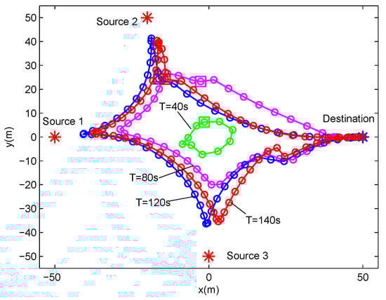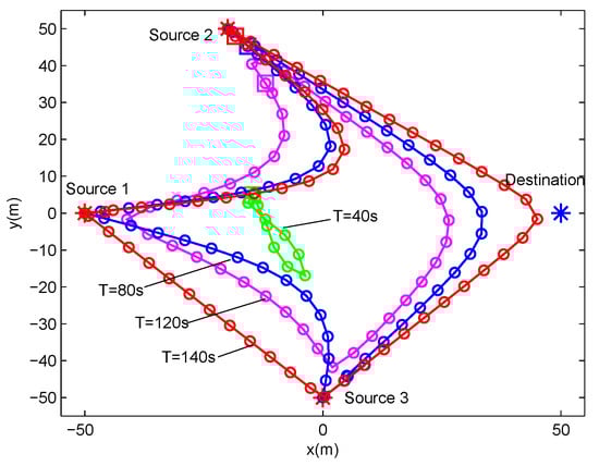 In Figure 3, we illustrate the UAV trajectory of delay-tolerant case under different factor for a given period s. The UAV trajectory is varying with the different values of . It can be readily comprehended that the UAV must satisfy each source requirement for information throughput in terms of , as shown in Equation (17). In other words, the UAV has to change its trajectory as the cost for the purpose of achieving the required fairness.