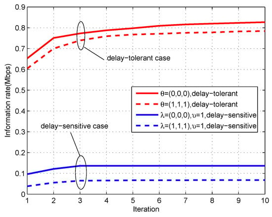 Figure 9 shows the convergence performance of Algorithm 1 applied in delay-tolerant case and delay-sensitive case. It can be observed that the proposed algorithm is always non-decreasing and can quickly converge to an optimized point for different factors, which indicates that the proposed design in this paper that uses SCA technique to solve the formulated non-convex problem is effective.