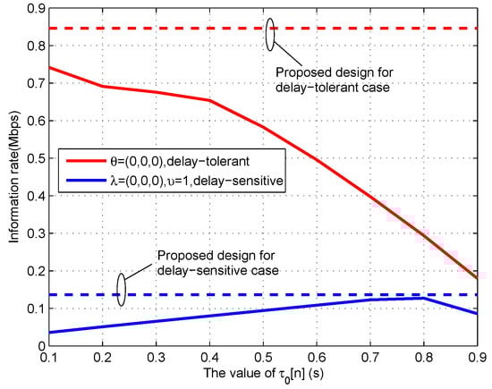 To show the effectiveness of Algorithm 1, Figure 10 shows the information rate received by the destination versus the fixed energy harvesting duration in each time slot, i.e., , for given period s. For the convenience of comparison, we plot the achievable rate of proposed design in which the value of is optimized. It can be observed that the case of fixed is worse than the proposed design, and the delay-tolerant case always outperforms the delay-sensitive case. Specifically, for the delay-tolerant case of , the achievable rate decreases as the value of increases, while, for the delay-sensitive case, the achievable rate first increases and then decreases. This phenomenon can be well comprehended by combining Figure 6 and Figure 10; the operation of WPT in each time slot is not the best choice for delay-tolerant case but is for the delay-sensitive case. In general, with the increasing value of , less time can be utilized for information transmit in each time slot, thus resulting in the rate decrease for large values of .