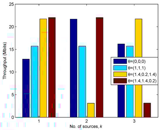 In Figure 11, we plot the throughput of each source under different factor of delay-tolerant case. In this picture, it can be intuitively observed that the different factors bring significant influence to the sources’ throughput, e.g., by comparing the case of with the case of . It illustrates that the sources achieve the largest throughput under the delay-tolerant case with , because, in this case, the UAV can fully exploit the mobility. Besides, under the fairest case, i.e., , equal throughput performance can be achieved by each source, but the sum amount of throughput is much lower than the case of , which means that the UAV satisfies the fairness requirement at the cost of sacrificing mobility.