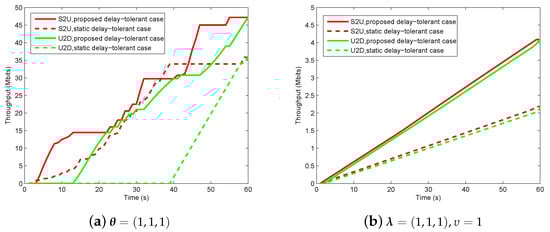 In Figure 12, we illustrate the information causality for period s under of delay-tolerant case and of delay-sensitive case. We compare the proposed design with the static UAV case where the UAV is fixed at an optimal location during the period T. It can be observed that the proposed design outperforms the static UAV case, as the static UAV case cannot enhance the relay’s throughput by trajectory design due to the static position, while the proposed design can enjoy the performance gains brought by UAV’s mobility. However, these two cases have some common characteristics in terms of curve tendency. Specifically, it can be observed that, at the beginning, no information transmit in the system, as the sources have to harvest energy first because they are initially assumed to be with no residual energy. When sources have enough energy to support WIT, they transmit information to the UAV in uplink until the harvested energy cannot support WIT. For the delay-tolerant case, the UAV would chose the suitable ground nodes including sources and destination to communicate as per the channel conditions, even though the factor of poses a fairness requirement over whole period. Different from this, the delay-sensitive case needs to severely satisfy the factor of requirement in each time slot, which, as a result, causes the throughputs of S2U and U2D to be generally increasing. In addition, we can also find that the total received information from sources equals the forwarded information to destination, which is in accordance with our expectation that the equality holds in Equation (16).