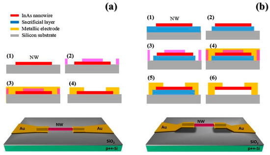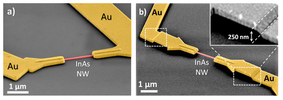 The basic building blocks of our devices consist of wurtzite n-type InAs nanowires, grown on (111)B InAs substrates, exploiting gold-catalyzed chemical beam epitaxy [52]. The NWs have an average length of 4 µm ± 250 nm and an average diameter of 60 nm ± 8 nm. NWs were mechanically detached from the substrate by means of sonication and dispersed in isopropyl alcohol (IPA). NWs were deposited onto a p++Si/SiO2 substrate by a technique of drop-casting. For suspended devices, the fabrication protocol includes a preliminary step, which involves the use of a sacrificial layer. For both device geometries, the sample was then patterned using standard e-beam techniques, using a positive polymethyl methacrylate (PMMA) e-resist. After the development and prior to metal evaporation (Ti/Au, 10/100 nm), the NW contact areas were passivated using a standard ammonium polysulfide (NH4)2Sx solution in order to promote the formation of low-resistance ohmic contacts. The fabrication protocols of the two device geometries are schematically depicted in Figure 1a (supported NW device) and in Figure 1b (suspended NW device). More detailed information about the fabrication protocol of suspended devices can be found in [57].