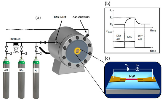 Schematic representation of the measurement setup used for sensing tests. (a) The setup consists of a 1000 cm3 stainless steel-test chamber, connected to a gas line fed from certified gas bottles, mixed through mass flow meters. A bubbler is connected to the line for obtaining humidity and ethanol air mixtures; (b) sketch of the transduced signal, i.e., the nanowire (NW) resistance variations as a function of time, related to the gas concentration inside the chamber during a test cycle; (c) scheme of the devices under test, showing the electric circuit for gas detection.