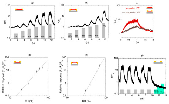 The results are summarized in Figure 4. Both the device architectures showed a very good response towards humidity exposure (Figure 4a,b, reporting the normalized resistance versus time). In particular, during each sensing cycle, an increase in the device resistance was observed upon exposure to humidity, followed by a drop of the resistance to the baseline value during the recovery period (dry air flushing). Moreover, the maximum value of the resistance during each sensing cycle increased by increasing the value of the relative humidity (r.h.). The results showed that the supported NW (Figure 4a) was sensitive to humidity, even in the low concentration range. This was not the case for the suspended NW (Figure 4b): in this case, humidity detection became evident from 40% r.h. The comparison of the normalized resistances for the two sensors for 50% r.h. is shown in Figure 4c. The graph shows a higher response for supported NW, together with faster dynamics. It is noticeable that in the case of suspended NW, the steady state in 50% r.h. condition was not reached within 1 h. This was confirmed by the calculated response times (31 and 45 min for supported and suspended devices, respectively) and recovery times (13 and 24 min, respectively). To calculate the relative response for suspended devices, we made the assumption that the sensor resistance recovered to the initial value: we calculated the relative response using the baseline resistance in dry air at the beginning of the measurement, together with the resistance value at the end of the humid pulse of gas.