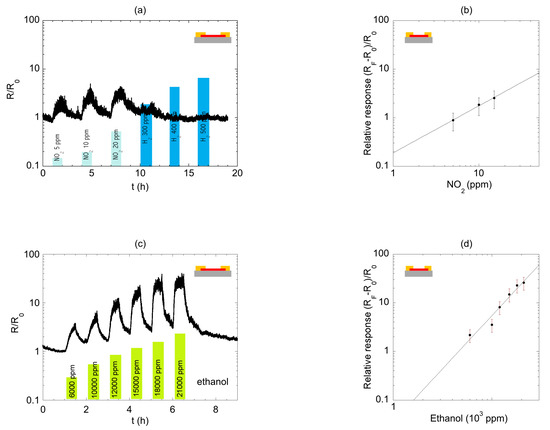 The tests with the other target gases were focused on the substrate-bound device only. Figure 5a shows sensing tests with NO2 (5–10–20 ppm) and H2 (300–400–500 ppm). The device was quite insensitive to H2 and could detect concentrations down to 5 ppm of NO2. The calibration plot (Figure 5b) showed that the data were fitted by a power law. The extrapolation of the fit to the axis limit gave an indication of the lowest detectable NO2 concentration, which was equal to 1 ppm. Figure 5c reports the dynamic resistance variation associated with ethanol concentration varying from 20% to 70%. The calibration plot for ethanol (Figure 5d) showed that this gas could easily be detected in the selected concentration range.