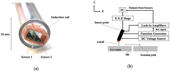 Recently, nondestructive testing methods using magnetic sensors instead of a pickup coil have been reported [4,5,6]. There are advantages to the use of a magnetic sensor. Magnetic sensors can detect a wide range of frequencies with constant sensitivity. Thus, several nondestructive techniques operated at a low frequency to detect subsurface and surface cracks in various structures have been reported [7,8,9]. In addition, magnetic sensors are typically small and can detect magnetic flux density with high resolution. Therefore, the differential of local magnetic flux density can be measured more flexibly using a magnetic sensor array. Using these advantages of magnetic sensors, we have demonstrated that magnetic noise can be reduced by the differential parameters obtained by a gradiometer of a magnetic sensor [10].
