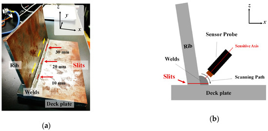 Figure 2 shows the positions of cracks in the welded part of the U-shaped rib sample and the scanning path. It is well-known that cracking tends to occur along the welds. Therefore, three artificial cracks of different lengths (10, 20, and 30 mm) were prepared along the welding angle by electric discharge machining. The cracks penetrated the rib, which was 6 mm thick, and the welds. Each crack width was 1 mm. A sine wave voltage of 2 Vp-p at frequencies between 1 kHz and 5 kHz was applied to the sensor probe, which was then manually moved along the scanning path for each crack and non-crack area.
