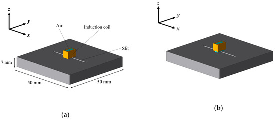 To evaluate the fundamental magnetic response and to estimate the intensity of the crack signal with different liftoff, the distributions of eddy current on the surface of a flat steel plate (SS400) and the magnetic field in an induction coil were simulated using the commercial software package JMAG (JSOL Corporation). The induction coil with the air area inside the coil was positioned at the center of the flat steel plate with a trough-hole slit of 7 mm depth, as shown in Figure 3. The resistance of induction coil was 1 Ohm. The typical permeability and conductivity of SS400 provided by JSOL were used for the simulation. The simulation was performed in the initial magnetization curve which was the linear region because the applied magnetic field was very weak. Each element was automatically divided into 0.4 mm meshes for the finite-element analysis. A sine wave voltage of 2 Vp-p at a frequency of 1 kHz was applied to the induction coil with different liftoff between 0.0 and 1.0 mm.