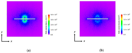 The eddy current was assumed to be induced along and under the induction coil. However, the eddy current flow was interrupted by the slit. Thus, the simulated eddy current was divided into two parts and the two parts of the eddy current flowed along the opposite of the slit edge (Figure 4). The eddy current density with 0.0 mm liftoff was large compared to that with 1.0 mm liftoff. This indicates that the intensity of magnetic flux induced by the eddy current is easily influenced by liftoff variations.