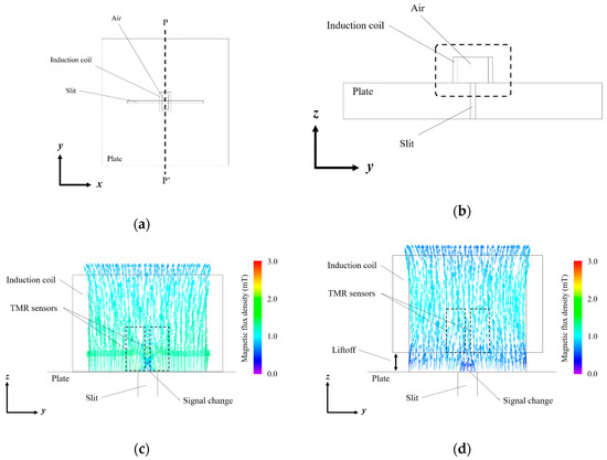 (a) Wire frame of the simulation model and cutting line of P to P’; (b) cross-sectional view of the cutting line; (c) simulation result of magnetic vector inside the induction coil with 0.0 mm liftoff; (d) simulation result of magnetic vector inside the induction coil with 1.0 mm liftoff. Legend: TMR, tunneling magnetoresistance.
