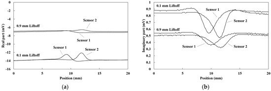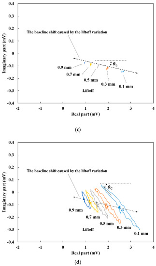 Although the influence of the liftoff variation may be reduced by the differential parameters, there is a case for not ignoring the influence of liftoff. When the sensor probe is not vertical to the surface, the baseline shifts of the two sensors are considered to be not the same because the liftoff of each sensor is different and the differential parameters are affected by the liftoff variations. Figure 8 shows the liftoff dependence of the differential vector when the sensor probe was tilted by 5 degrees. The peak-to-peak values of differential parameters are also described in Figure 8c,d. The baselines of each differential parameter shifted to zero and the peak-to-peak values decreased as the liftoff increased. This result suggests that the differential parameters can be influenced by the liftoff variations. However, the baseline shift of the real part was large compared with that of the imaginary part. This means that the Lissajous curve of the differential vector appears mainly in the X-direction when the signal fluctuates by the liftoff variations. Additionally, the crack signal is assumed to appear in a different direction.