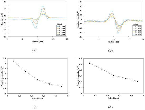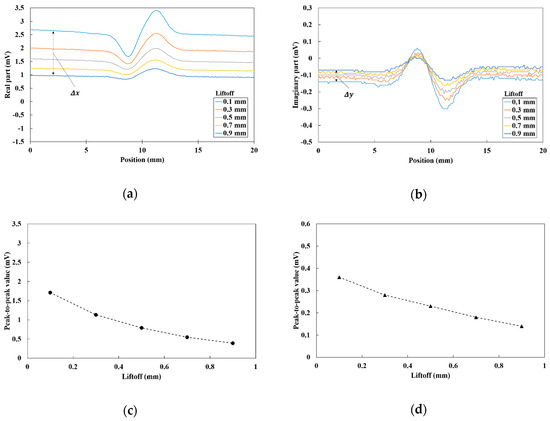 The differential vector was able to be obtained from the dual-channel sensor probe. Figure 7 depicts the liftoff dependence of the differential parameters for the real part () and the imaginary part (). The measurement sample was the flat plate and the frequency was 1 kHz. The sensor probe was vertically line-scanned with different liftoff between 0.1 and 0.9 mm. The peak-to-peak values of the differential parameters are also described (Figure 7c,d). The baselines of the differential parameters at both sides of the slit became almost the same compared to the single parameters, which are described in Figure 6. The magnetic noise seemed to be reduced by the differential value. The peak-to-peak values decreased as the liftoff increased. On the other hand, even when the liftoff increased, the baselines were almost zero. These results mean that the influence of the liftoff variations could be also reduced by the differential value obtained by the dual-channel sensor.