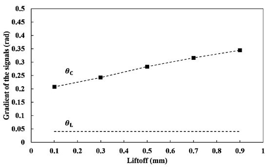 As well as , the gradient of the crack signal can be obtained by dividing the peak-to-peak value of the imaginary part by that of the real part. Figure 9 shows the gradient of the crack signal and liftoff signal . The same data from Figure 8 was used to calculate the gradients. In any liftoff the was large enough compared to the . This result suggests that the crack signal appears in a different direction from the liftoff signal in the Lissajous curve of the differential parameters. In the next subsection, the Lissajous curve of differential parameters is described.