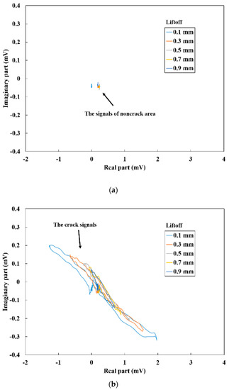 In order to show the measured signal, conventional ECT typically uses a Lissajous curve that displays the real and imaginary parts, which are produced from the change of the crack-induced signal from a single sensor output [15]. The Lissajous curve using the parameters of a single sensor is easily affected by the magnetic noise and the liftoff signal. Hence, the differential parameters of a dual-channel magnetic sensor have been used for the Lissajous curve to reduce the magnetic noise and discriminate the crack signal from the liftoff signal [16]. However, the signal fluctuation which occurs in a practical inspection of complicated structures has been poorly understood.