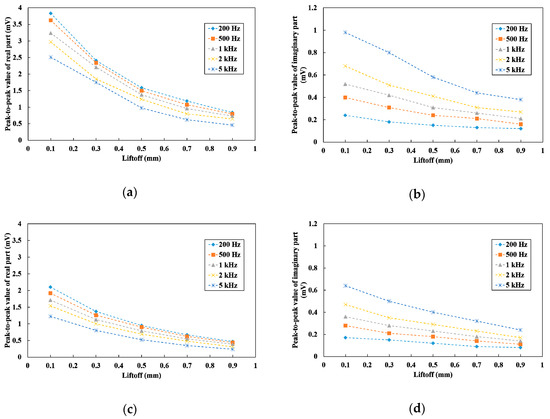 Peak-to-peak values at frequencies between 200 Hz and 5 kHz with different liftoff: (a) real part of the vertical line-scan; (b) imaginary part of the vertical line-scan; (c) real part of the tilted line-scan; (d) imaginary part of the tilted line-scan.
