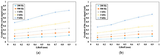 The gradient of the crack signal at frequencies between 200 Hz and 5 kHz with different liftoff: (a) the vertical line-scan; (b) the tilted line-scan.