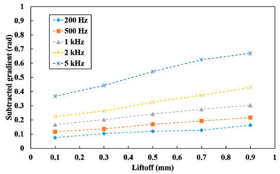 However, also of consideration is that the gradient of the liftoff signal also increases as the frequency increases, which makes it difficult to extract the crack signal. To confirm these effects, the subtracted gradient which was the angle formed by the crack and liftoff signal was calculated, as seen in Figure 13. The data was obtained by tilted line-scan. Even if the gradient of the liftoff increased with frequency, the gradient of the crack signal was large enough to discriminate. Consequently, the subtracted gradient at 5 kHz was maximum and this frequency was optimum in the range of frequency between 200 Hz and 5 kHz. This result suggests that the crack signal can be clearly extracted using the Lissajous curve even when the liftoff variation occurs due to the manual probing of complicated structures. In the next subsection, the measurement of the crack signal in the complicated structures is demonstrated using the developed method.
